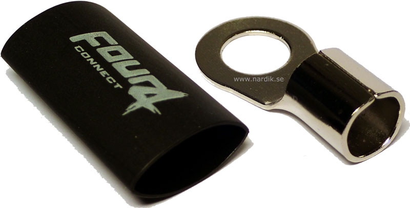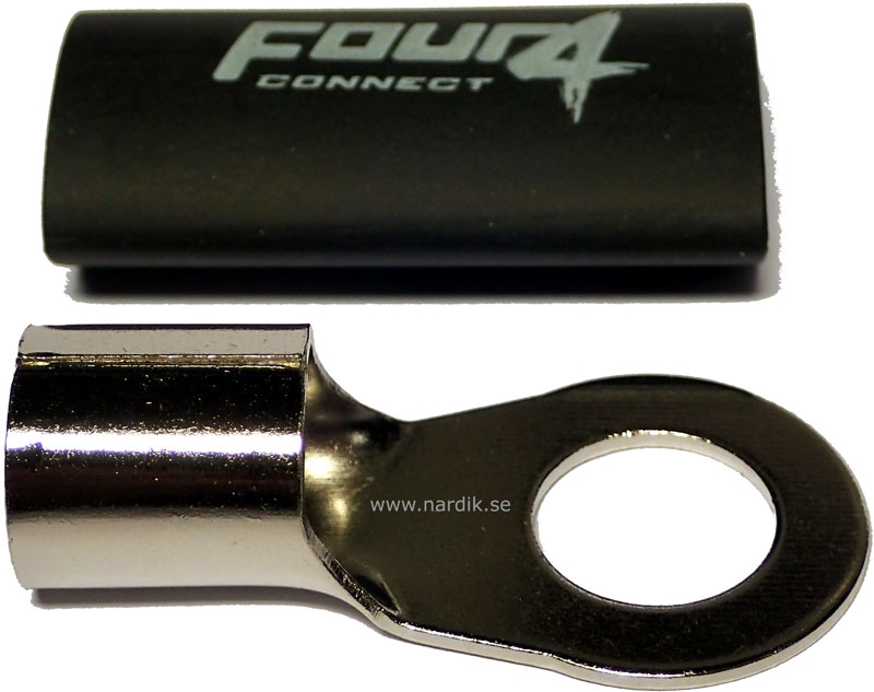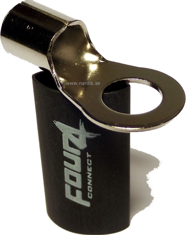 4Connect ringkabelsko har krympslang av bra kvalité som isolator bättre än vanliga gummi- eller plasthylsor. Krympslang skyddar anslutningen mycket bättre mot oxidation än plast- eller gummihylsor. Kabelskon är Rhodinerade för att säkra anslutningen i flera år.