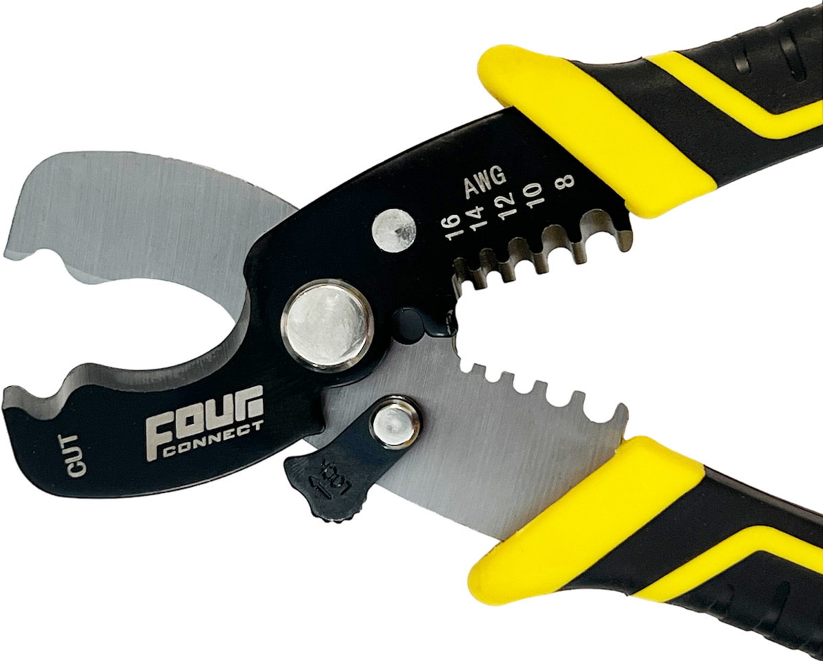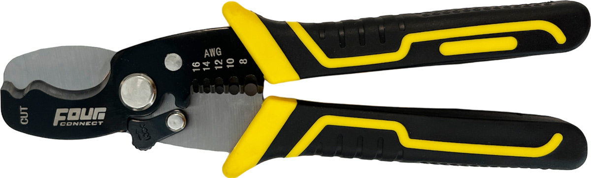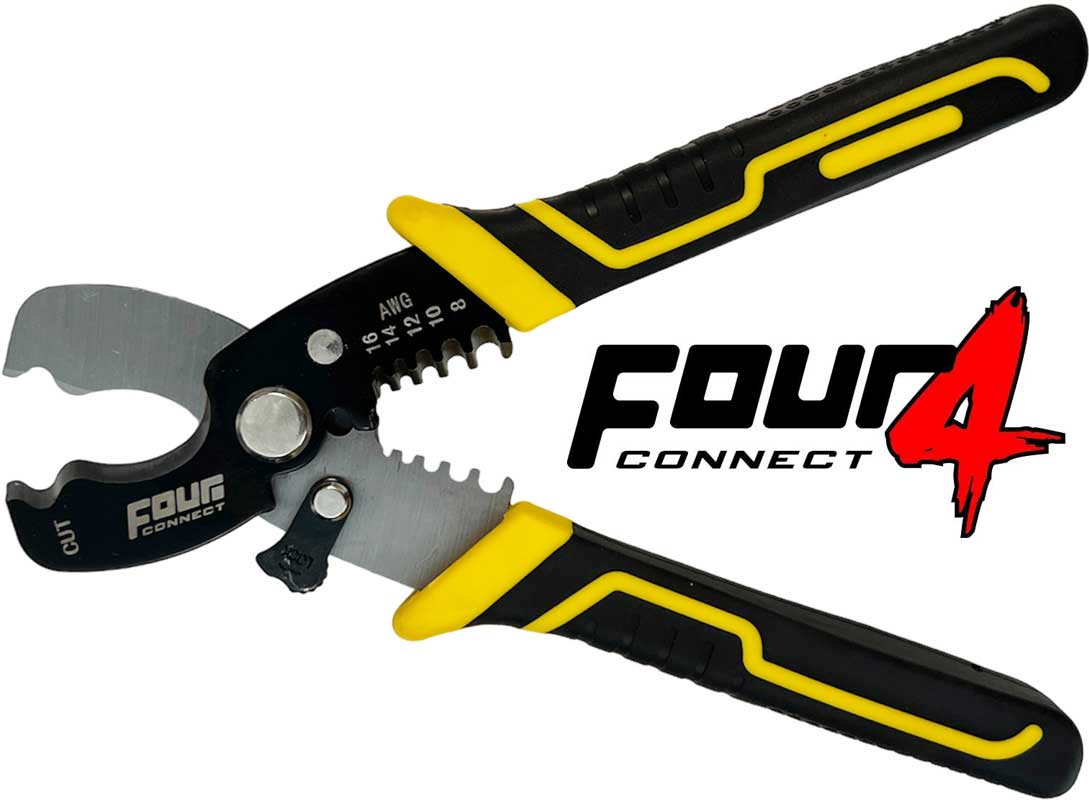 Dagens fintrådiga och därmed mjuka kablar ställer höga krav på rätt verktyg för kapning och skalning. 4Connect har tagit fram en bra tång som gör jobbet mycket enklare. Ett måste i varje garage. Mycket prisvärd!