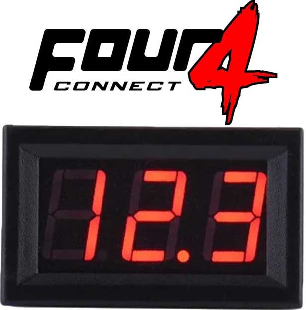 4Connect Voltmätare 9-24 Volt. Fuktskyddad. Röd display. Mycket smidiga mått och hög kvalitè. Monteringshål 26x48 mm, djup 22mm.