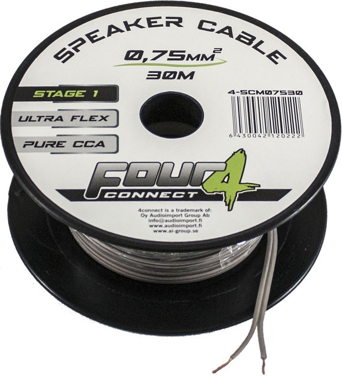 4Connect 4-SCM 2x0.75mm² högtalarkabel å bobin är en prisvärd lösning Har ett stort antal trådar och en silikonbaserad gummiisolering som förblir flexibel även i kallt klimat. Polmärkt och levereras på bobin med 15 meter kabel.