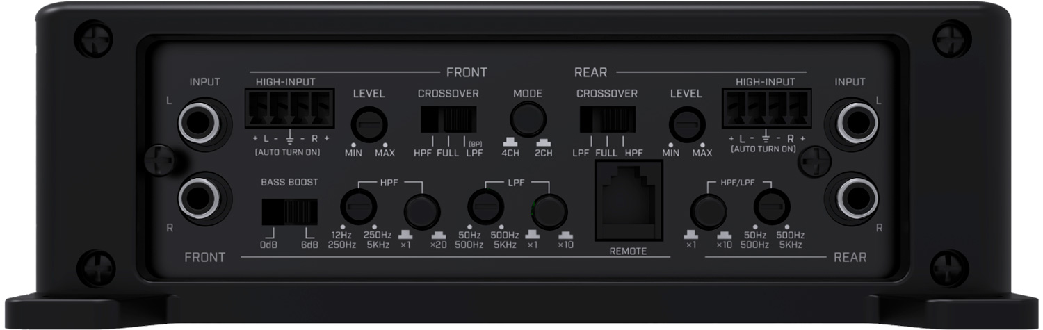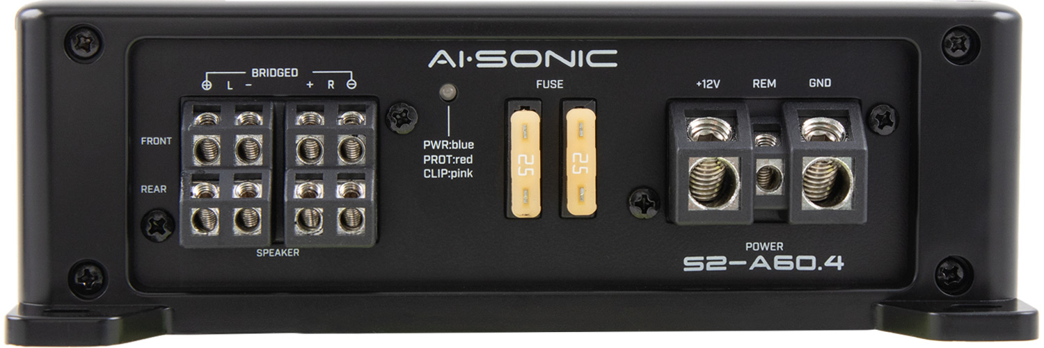AI-Sonic S2-A60.4 Slutsteg med 4 x 105W 2Ω eller 2 x 210W 4Ω, 12Volt 1% THD. Låg & högpassfilter, BassBoost, högnivåingång med autostart. Förberedd för kablad fjärrkontroll. Hög ljudkvalité. Pris för 1 styck