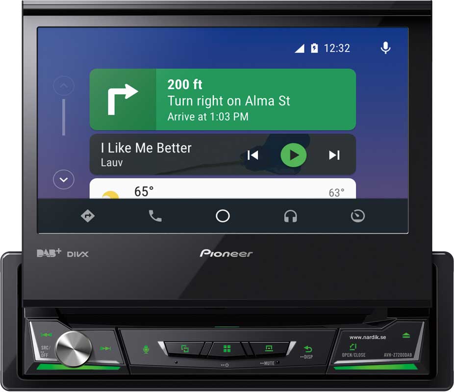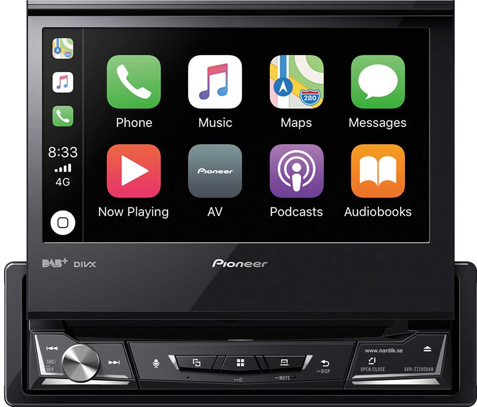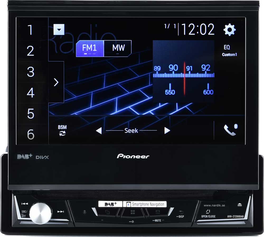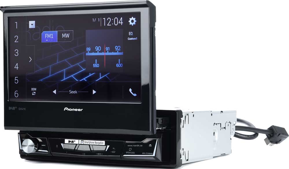 1-Dins multimediaspelare med en 7-tums tydlig, resistiv, utfällbar pekskärm med 24-bitars true colour-färg, enkel smarttelefonuppkoppling via USB-kabel som stöder Apple CarPlay och Android Auto, DAB/DAB+ Digital Radio, Waze (via Apple CarPlay/Android Auto), Bluetooth och en 13-bands grafisk equalizer