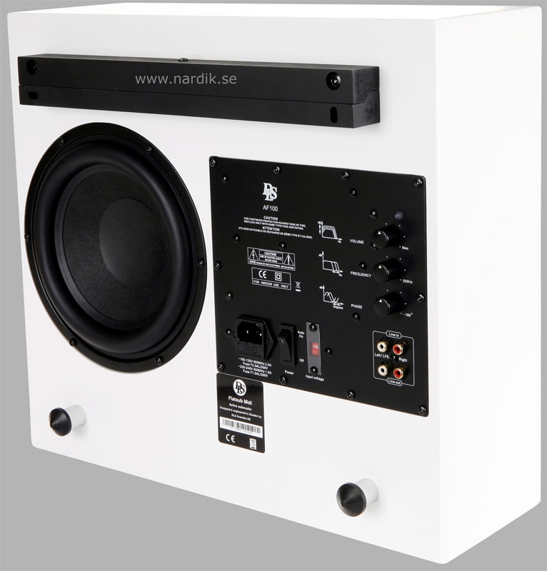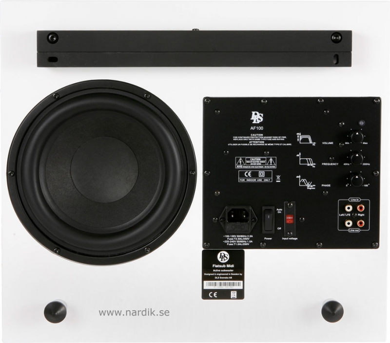 DLS FLATSUB Midi är en aktiv subwoofer. Konstruerad för att hängas på väggen eller placering på golvet, t.ex. under en soffa.