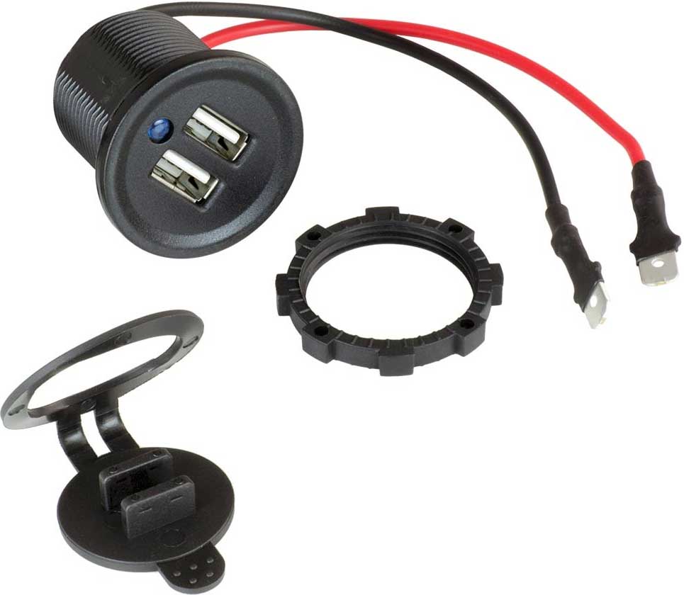 Vattentät. Dubbla USB-uttag (USB-A + USB-C) som ger 2 x 2,1A ström för att ladda telefon, surfplatta eller praktiskt taget vilken typ av enhet som helst som kan laddas via USB. Uttaget fungerar med ingångsspänning 12V och 24Volt.