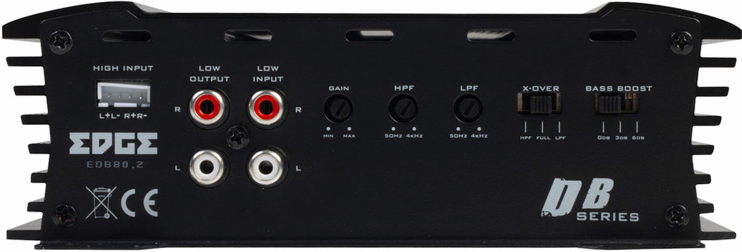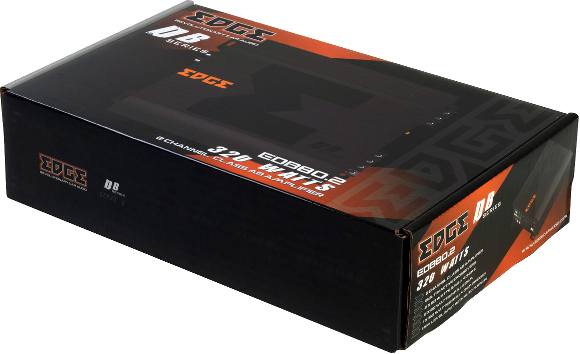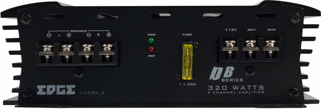 Edge EDB80.2LITE-E2 2-kanaligt slutsteg 320 Max, 2x80W 2Ω RMS, 2x60/1x160W 4Ω RMS. Hög eller lågpass filterter RCA in/ut Bas Boost Högnivå med autostart. Pris för 1 styck