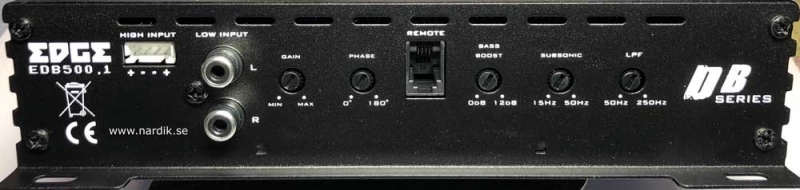 Edge EDB500.1-E9 Class-D Monoblock för bashögtalare 1000W Max, 500W 1Ω RMS, Lågpass filter och Subsonic RCA in/ut Bas Boost Högnivå med autostart Fjärrkontroll Pris för 1 styck & så långt lagret räcker