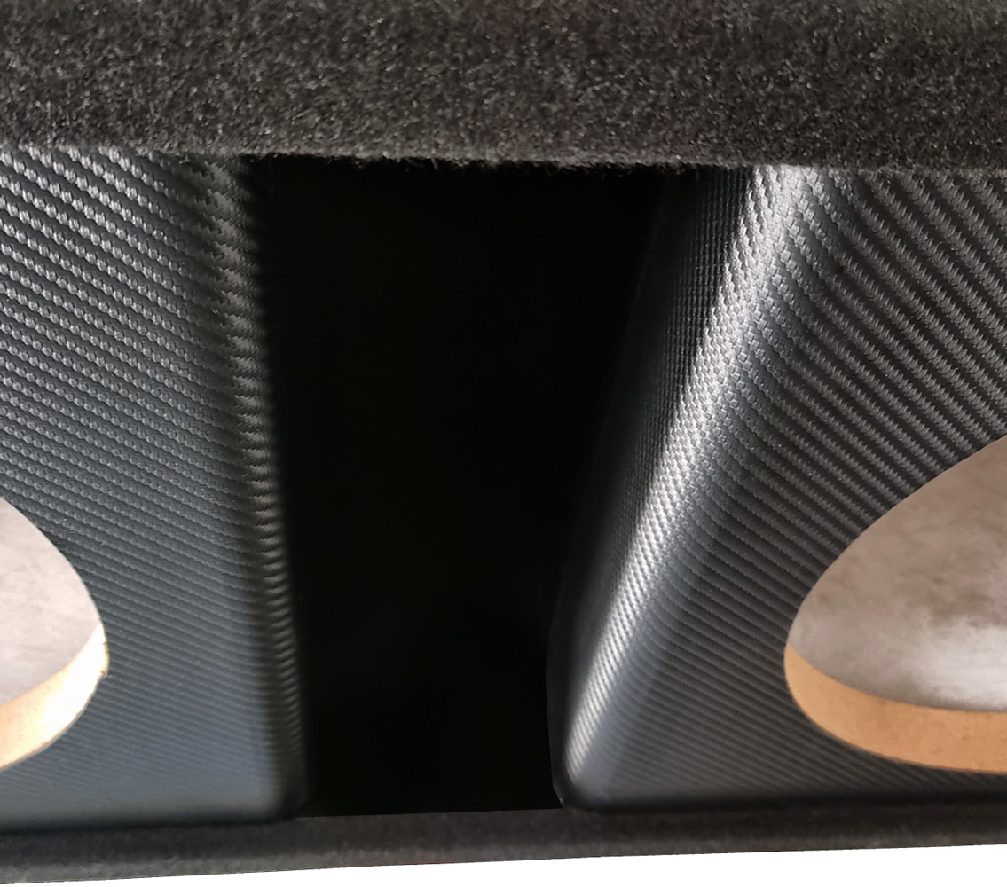 FOUR Audio 4-AI212SLOT tom baslåda för 2 stycken 12". 2x40 liter, avstämd 38 Hz, slotport, bygga av MDF, klädd med svart trunklinear matta och Carbon look på fronten. Yttermått 930 x 380 x 400 mm. Säljs enbart för avhämtning i butiken Örnsköldsvik. Pris för 1 styck