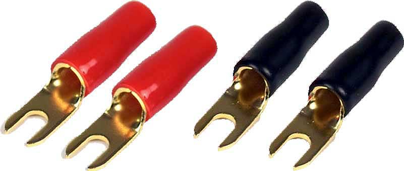 Gaffel kabelskor. För 6-10 mm2 kabel. Stiftbredd 7,5 mm. Förpackningen innehåller 4 kabelskor, 2 svarta & 2 röda skyddshylsor.