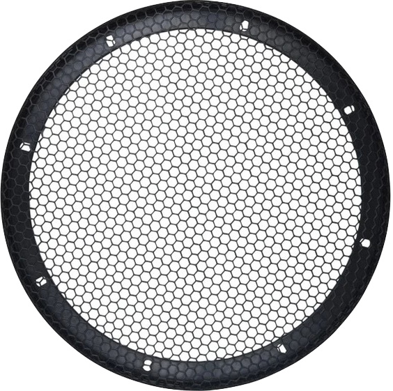 Ground Zero 10" midbas galler. Snygga vasrta metall galler svart med svart färtring i plast. Grovmaskig, av metall. Ytterdiameter x mm, höjd x mm. Levereras 1 styck.