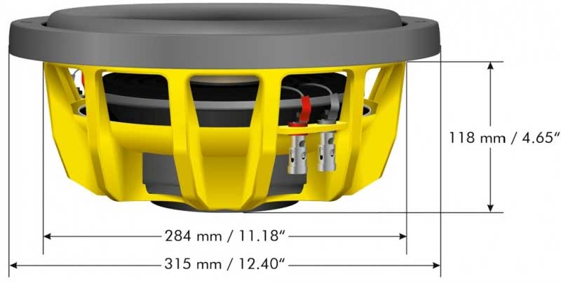 12" subbas. 580 Watt RMS, 1200 Watt SPL. Dubbla talspolar 2x2Ω. Flat 118 mm monteringsdjup. Basreflex låda 22-29 liter. Lämplig förstärkare 500-1200 Watt RMS. Klippel® optimized. Pris för 1 styck