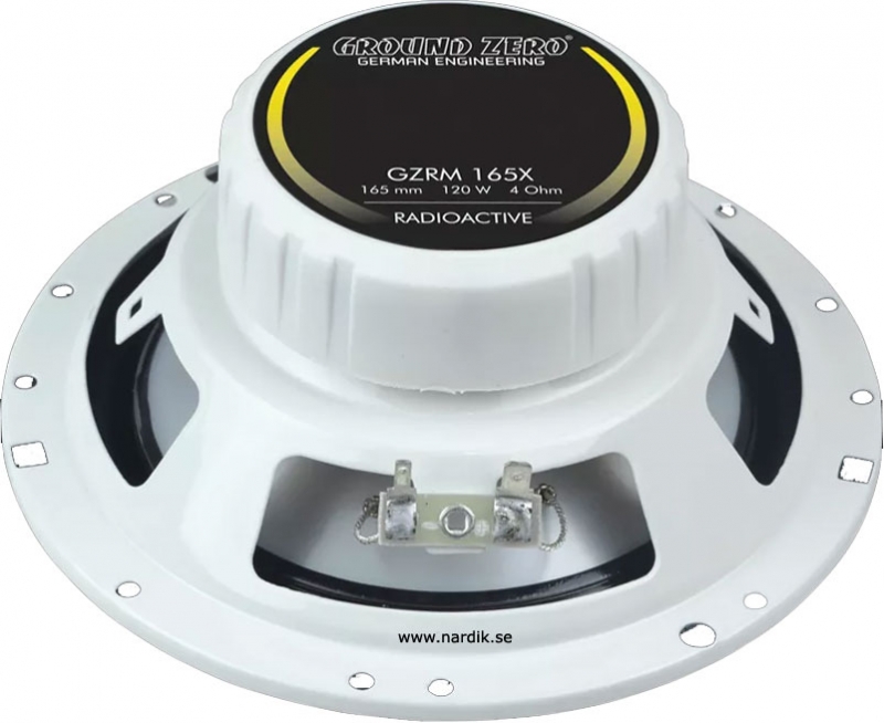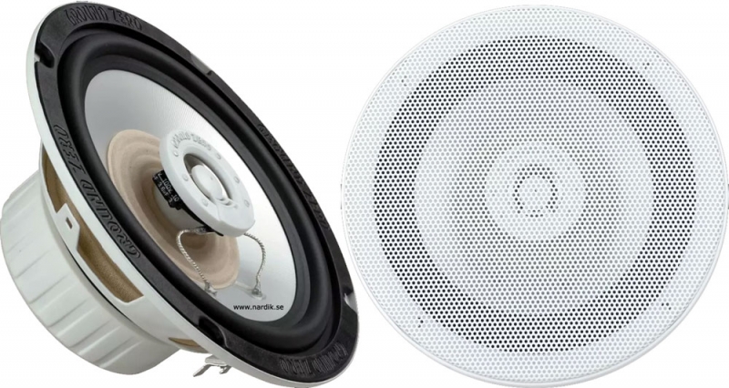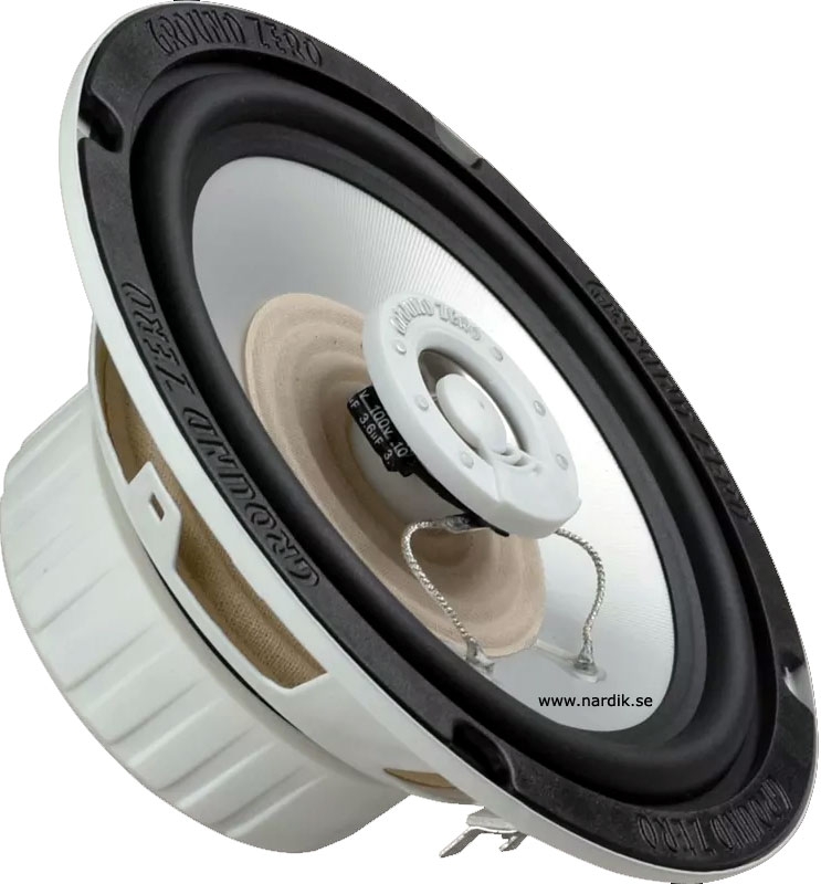 | Ground Zero har här prioriterat ljudkvalité i marin koaxial högtalare. Har konstruerat en bra koaxial som är tålig och de utan att pruta på ljudkvalité. Ferrit magnet i stället för keramisk magnet ger 30% mer kraft. Pressade stålkorg med låg resonans. Kantupphängning av gummi för lång livslängd. 25mm stor talspole ger bra kylning och hög effekttålighet. 13 mm Mylar kondiskant. Se på riset! Levereras med snygga vita metallgaller galler. Pris för ett par. |
