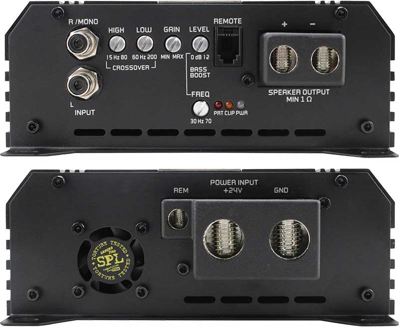 24 Volt. 1 kanal för subwoofer. Ett effektmonster i miniformat 255 x 150 x 58 mm! GZCA 3000.M1-24V Class-D slutsteg 1x3180Watt 1Ω eller 1x1825Watt 2Ω, 4500Watt max!. Stabil i 1Ω. Delningsfilter helt anpassad för bashögtalare av hög kvalité. Ställbar basboost. Levereras med fjärrkontroll. Rejäla anslutningar. Fläktkyld. Pris för 1 styck
