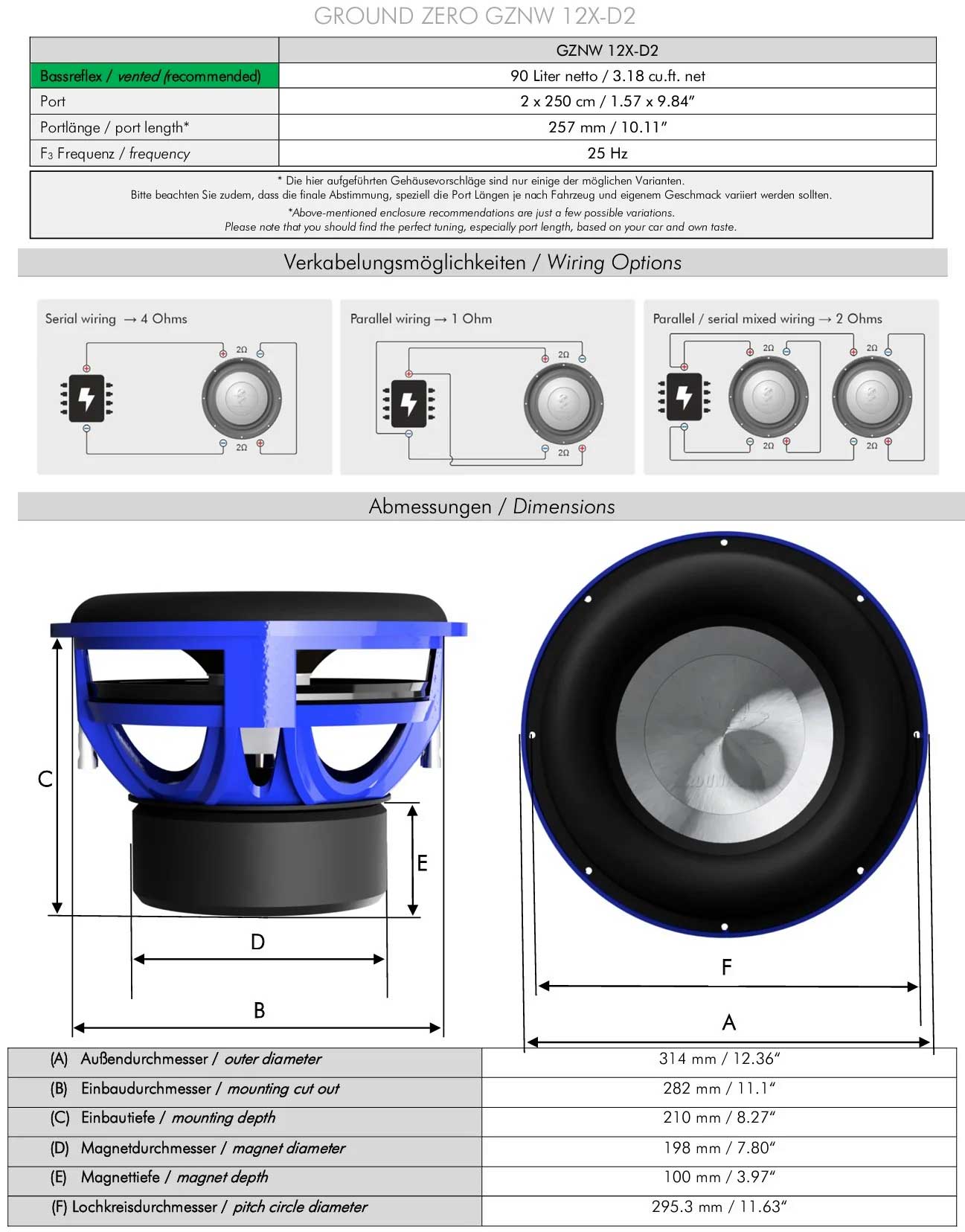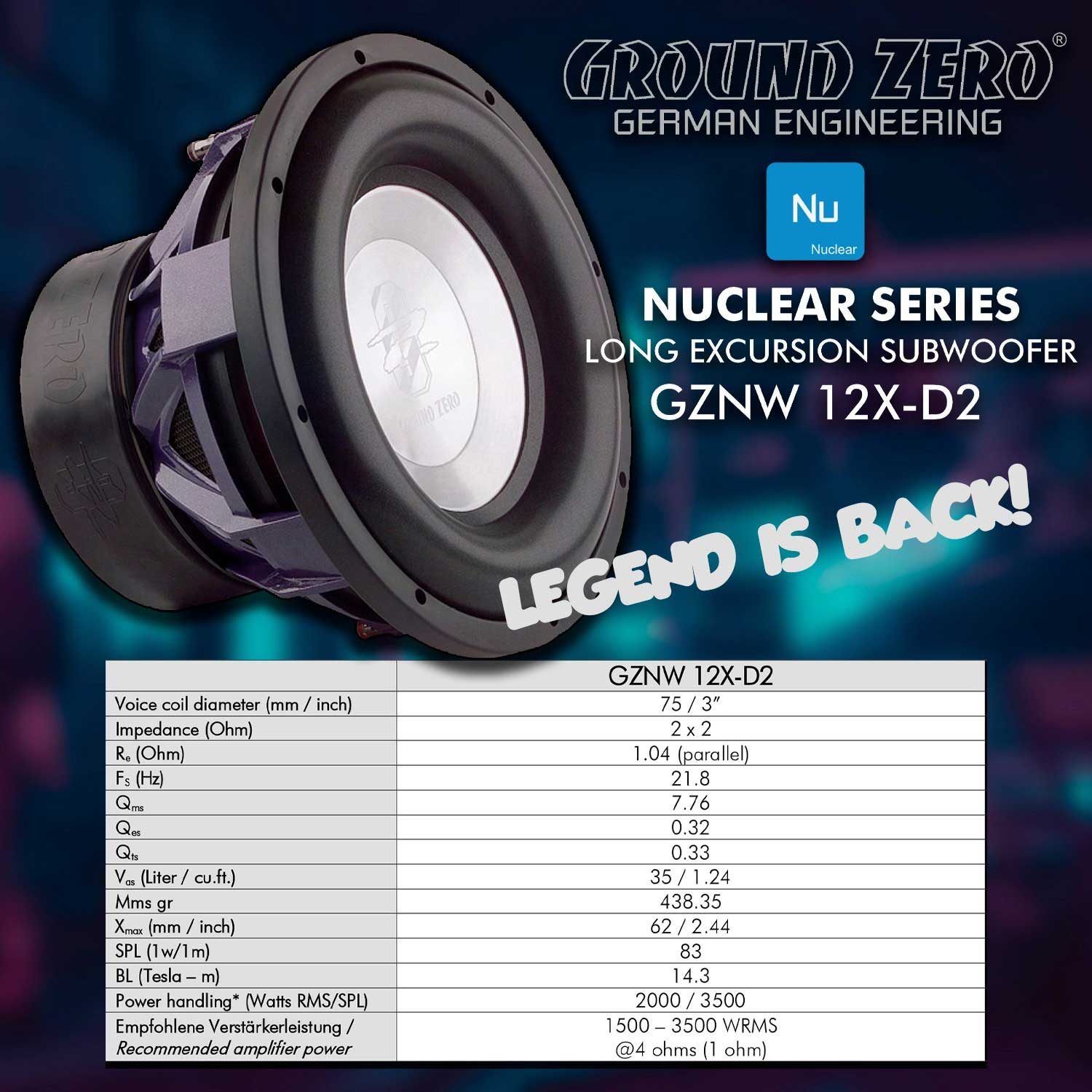 High performance long excursion subwoofer GZNW 12X-D2 12" subbas. 2000 Watt RMS, 3500 Watt SPL. Dubbla talspolar 2x2Ω. Basreflex låda 60-90 liter. Lämplig förstärkare 1000-3500 Watt RMS. Klippel® optimized. Pris för 1 styck