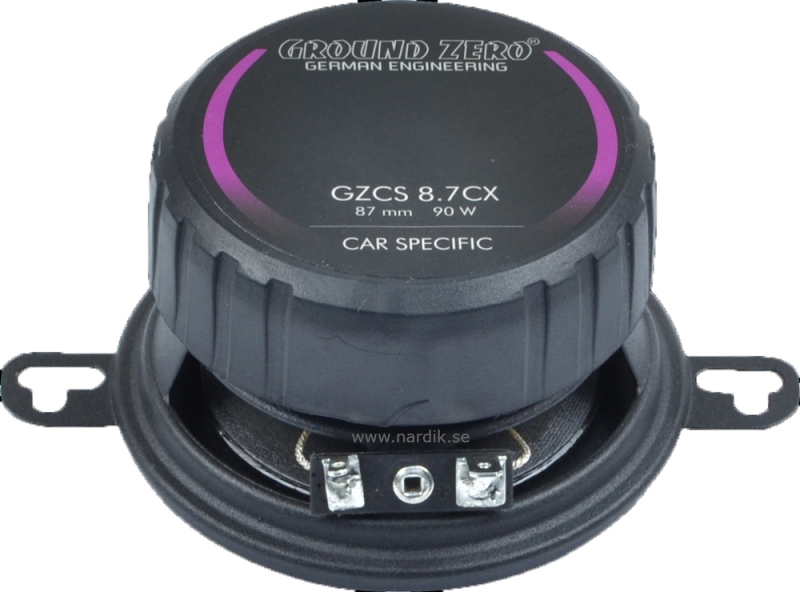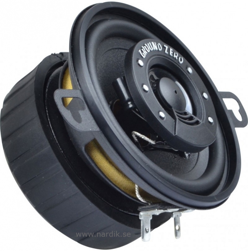 | 2-väga 3,5" koaxial högtalare. Ett lätt sätta att uppgradera originalljudet i bilen. Kan med fördel drivas med en slutsteg eller bilstereo. 90 Watt max, 50 Watt RMS. Kan monteras i bilens förberedda original uttaget eller på de ställen du behöver en liten högtalare med bra ljud. Levereras utan galler. Detta är Ground Zero CS - Pressad stålkorg med låg egenresonans. - Konmaterial för basen är behandlad Cellulosa för sina sina goda ljudegenskaper och stora dynamik. - Gummiupphängning ger konstant ljudegenskaper och lång livslängd. - Basen har en kraftig Ferrit magnet för kontroll, effektivitet och effekttålighet. Har magnetskydd. - Super diskant med Neodym magnet. Öka effekttålighet och låg distorsion. - Hög effekttålighet, 50 Watt RMS - Prisvärda - mycket ljudkvalité för pengarna |