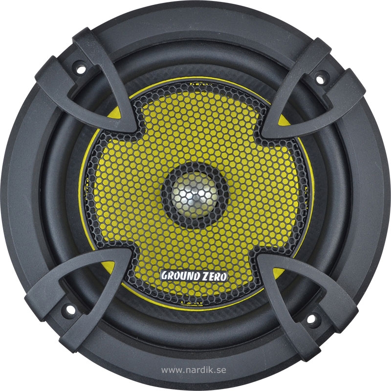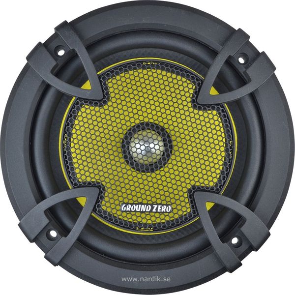 Ground Zero 6,5" 2-vägs högtalarsystem. 3Ω ger möjlighet för större effektuttag från förstärkaren. 150 Watt max, 100 Watt RMS. Hifi & SPL. Fasplugg. Valbara nivåer. Priset för ett par