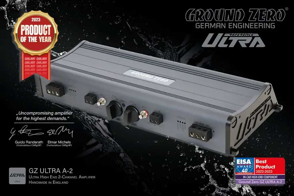 Ground Zero ULTRA-A2 Ultra-high-end analogue 2-channel amplifier 2x 450W (@ 1Ω) “BEST PRODUCT – IN-CAR HIGH-END COMPONENT”. Beställningsvara. Förberedd för vattenkylning! Pris för 1 styck.