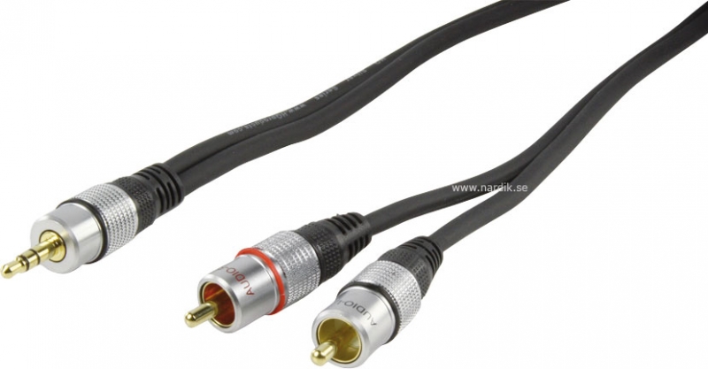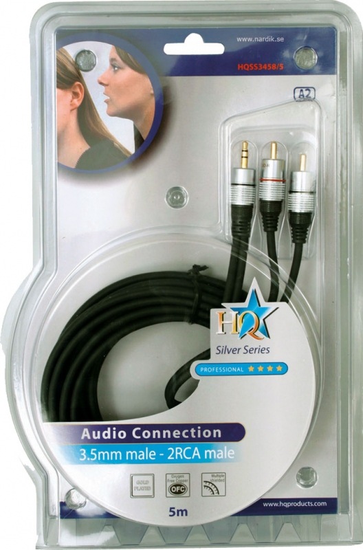 HQ Super Silver AUX_RCA stereo kabel. 3,5 mm hane - 2xRCA hanar. Analogt ljud. Dubbelskärmad för att effektivt utestänga störningar. OFC koppar i ledarna ger minimala förluster. Rejäl kvalitets kabel där kontakterna har Metall hölje och 24 k guldpläterade kontaktytor.