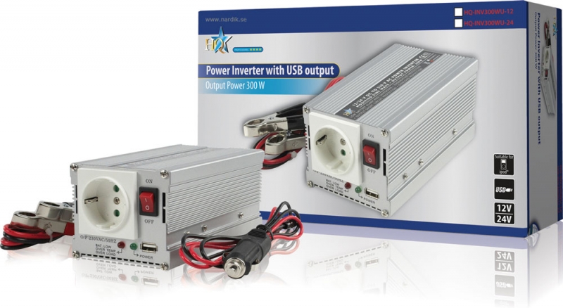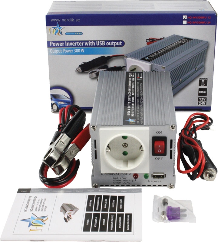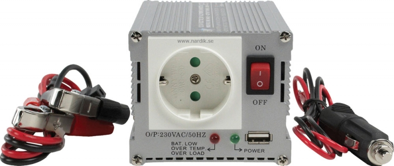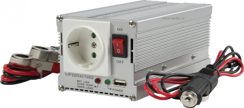 Modifierad sinusvåg spänningsomvandlare som omvandlar 12 V DC från bil- eller båtbatteri till 230 V AC. Med denna kan 230 V-utrustning användas överallt! Omvandlaren har en väldigt hög peak-uteffekt och USB-porten. Rekommenderas inte till känslig elektronikr.