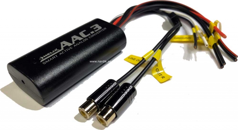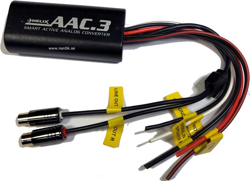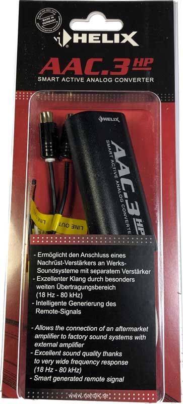 | När du vill uppgradera ljudet från din original monterade bilstereo men t.ex slutsteg och baslåda. - Anslut denna signalomvandlare (hög till lågnivå) för att generera en stereosignal från högtalarsignalen på originalmonterad bilstereo eller fabriksinstallerad förstärkare. En perfekt matchning för att uppgradera fabriksljudsystem "ADEP.3-krets" till förbikoppling av radiodiagnossystem "Double Activation Circuit" - genererar en +12 V-fjärrsignal på två olika sätt för att slå på & av anslutna förstärkare Utmärkt ljudkvalitet tack vare högupplöst frekvensrespons (18 Hz - 80 kHz). Tillverkad i Tyskland. - Helix AAC.3 är inte enbart en mycket välljudande hög till lågnivå omvandlare den är också en problemlösare i många moderna bilar med CAN system så som Audi, BMW, MB, Mazda med flera. - För optimal ljudkvalité och funktion finns 2 olika utföranden. AAC.3 upp till 16 Vrms (= 65 Watts / 4Ω) AAC.3HP upp till 25 Volts (= 155 Watts / 4Ω) - Mer info HELIX AAC.3