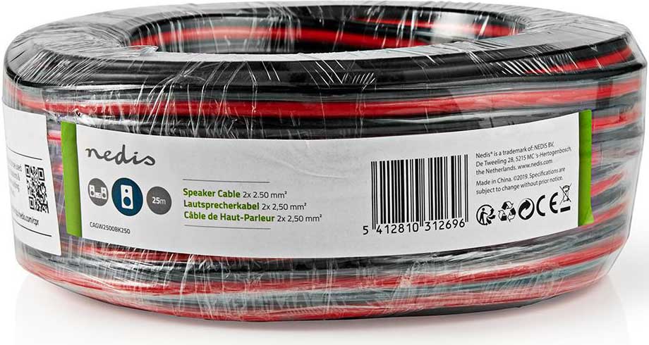 nedis Högtalarkabel 2x2,5mm² 15 meter. Smidig och prisvärd högtalarkabel med ledare av Kopparpläterad Aluminium (CCA). Bra elektriska egenskaper. Kabel för bil och hem. Smidig att dra. PVC isolering. Tydligt polmärkt gör del lätt att hålla reda på plus och minus. Levereras på rulle om 15 m.