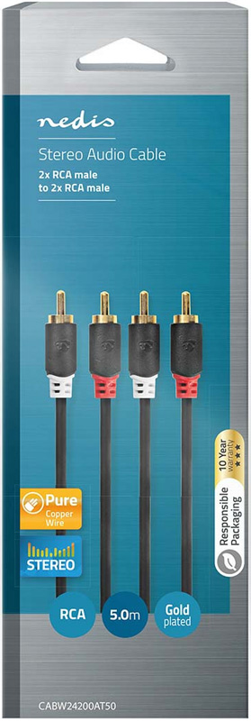 Nedis skärmad RCA Audio stereokabel. Koppar ledare. Smidig kabel för överföring av analoga signaler. God avskärmning mot störningar. Gjutna RCA kontakter med guldpläterade kontaktytor. Dragavlastning minimerar risken för kabelbrott. Kabeldiameter 2x4mm. Goda ljudegenskaper och passar både för bilstereon och hem hifi. Kabellängd 5 meter.