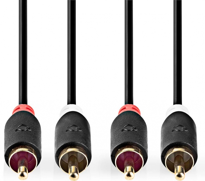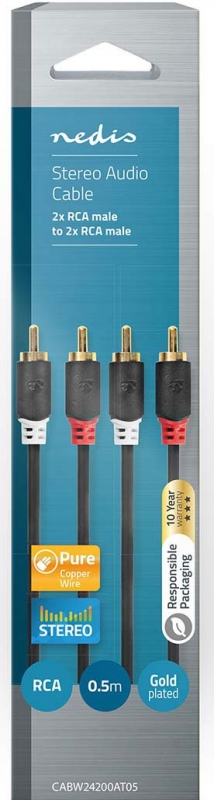 Nedis skärmad RCA audio stereokabel. Koppar ledare. Smidig kabel för överföring av analoga signaler. God avskärmning mot störningar. Gjutna RCA kontakter med guldpläterade kontaktytor. Dragavlastning minimerar risken för kabelbrott. Kabeldiameter 2x4mm. Goda ljudegenskaper och passar både för bilstereon och hem hifi. Kabellängd 0,5 meter.