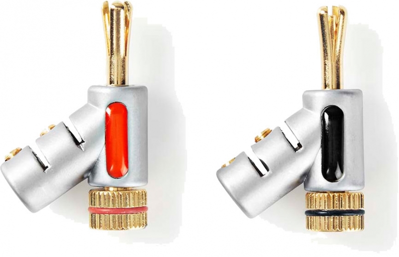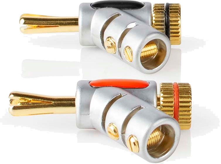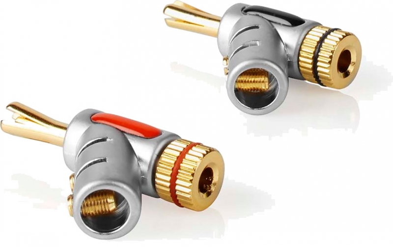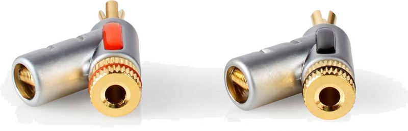 Nedis vinklad banan hankontakt. Guldpläterade kontaktytor med skruvanslutning. För kabel upp till 6 mm². Har dubbla skruvar för fastlåsning av högtalarkabeln. Rejäl kontakt gjord helt i metall Zinc Aluminium. Påbyggbar med fler banankontakter. Pris för 2 styck.