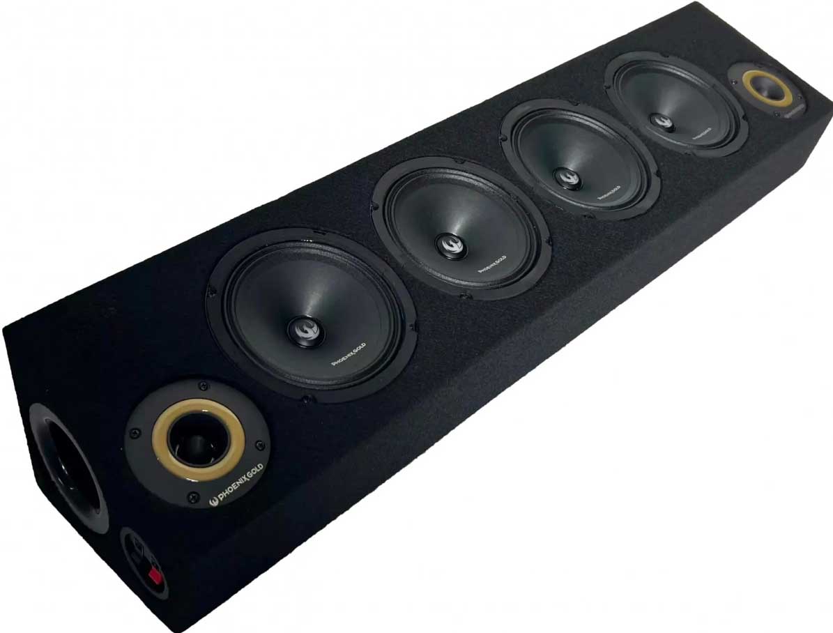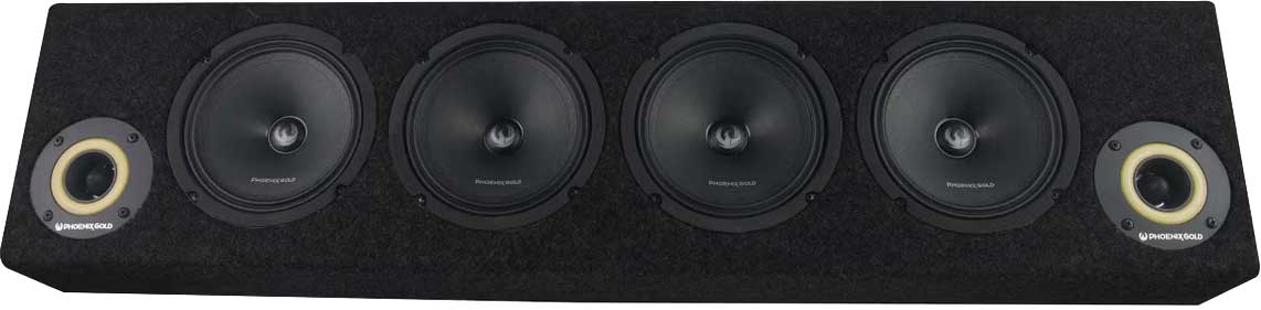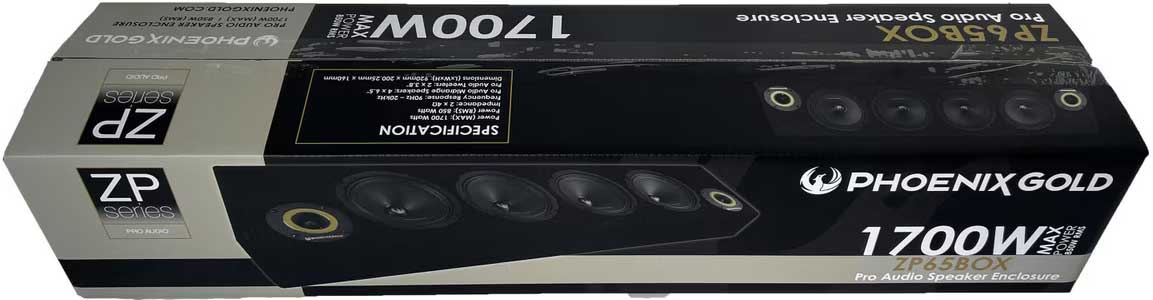 Phoenix Gold ZP65BOX Full-Range Speaker Box. 850 Watt RMS, 2 x 4Ω. Bestyckad med 4 stycken 6,5" mellanbas + 2 stycken 3,8" Bullet diskanthorn. Låda byggd med MDF och klädd med trunkliner matta. Pris för 1 styck