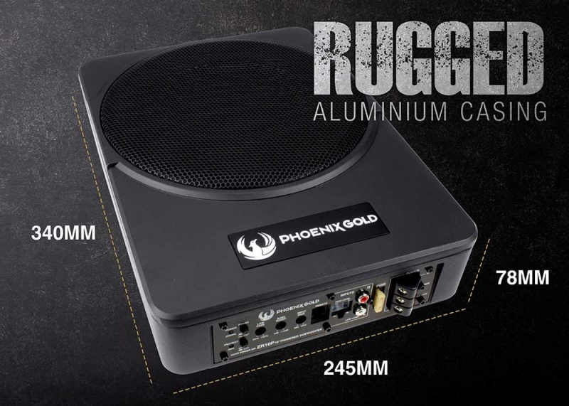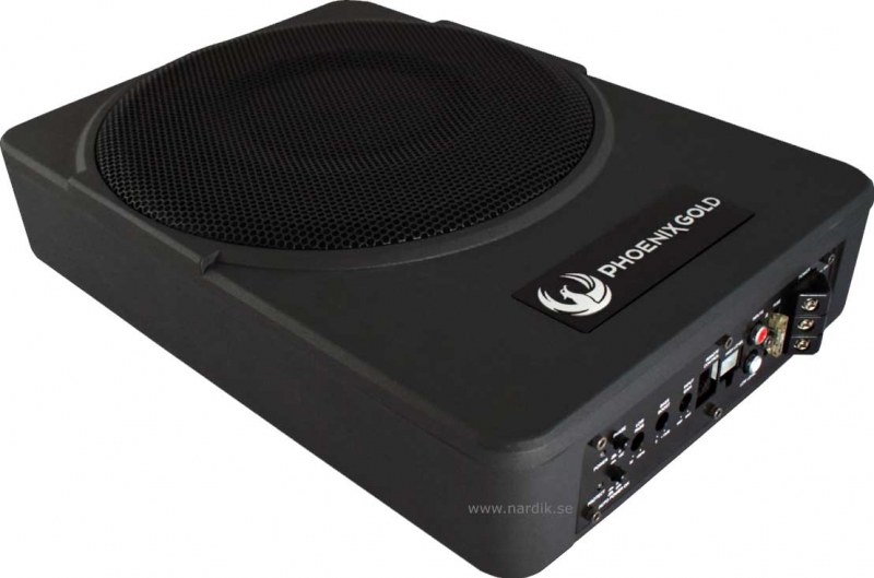 | Phoenix Gold hittills bästa kompakta baslåda. 10" aktiv baslåda som plattats till för att förenkla monteringen. Enbart 78mm hög! Denna baslåda är ett enkelt sätt att kompletterar bilens högtalare för ett fylligare basljud. Inbyggd förstärkare byggs med högkvalitets komponenter för bra ljudkvalité och konkontroll. 200Watt RMS, 400Watt Max. Basboost och subsonic utökar upplevelsen. Stabil konstruktion med gjutet Aluminium chassi. Kan anslutas till de flesta modellerna av bilstereo. Har både hög och lågnivåingång. Levereras med fjärrkontroll, som har 4,5 m kabel. Kan monteras liggande, hängande eller stående. |