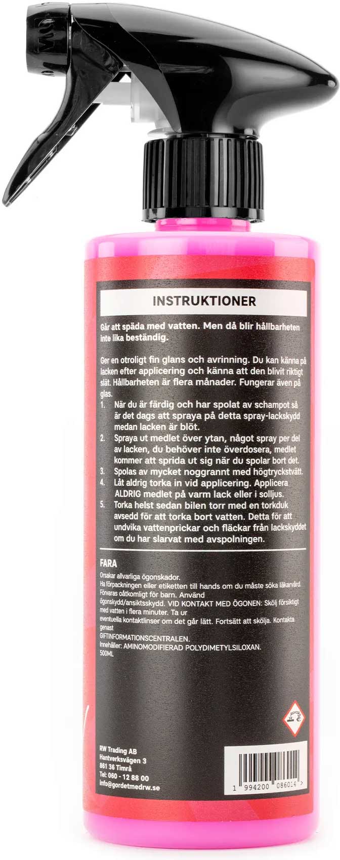 Detta är ett riktigt lackskydd som tar 2 minuter att applicera. Läggs på blöt lack och spolas av med vatten. Ger en brutalt fin vattenavrinning och lämnar en lackskyddande glansig yta. Produkten är mycket dryg och räcker till många appliceringar. Hållbarheten är flera månader och produkten kan även appliceras på glas.