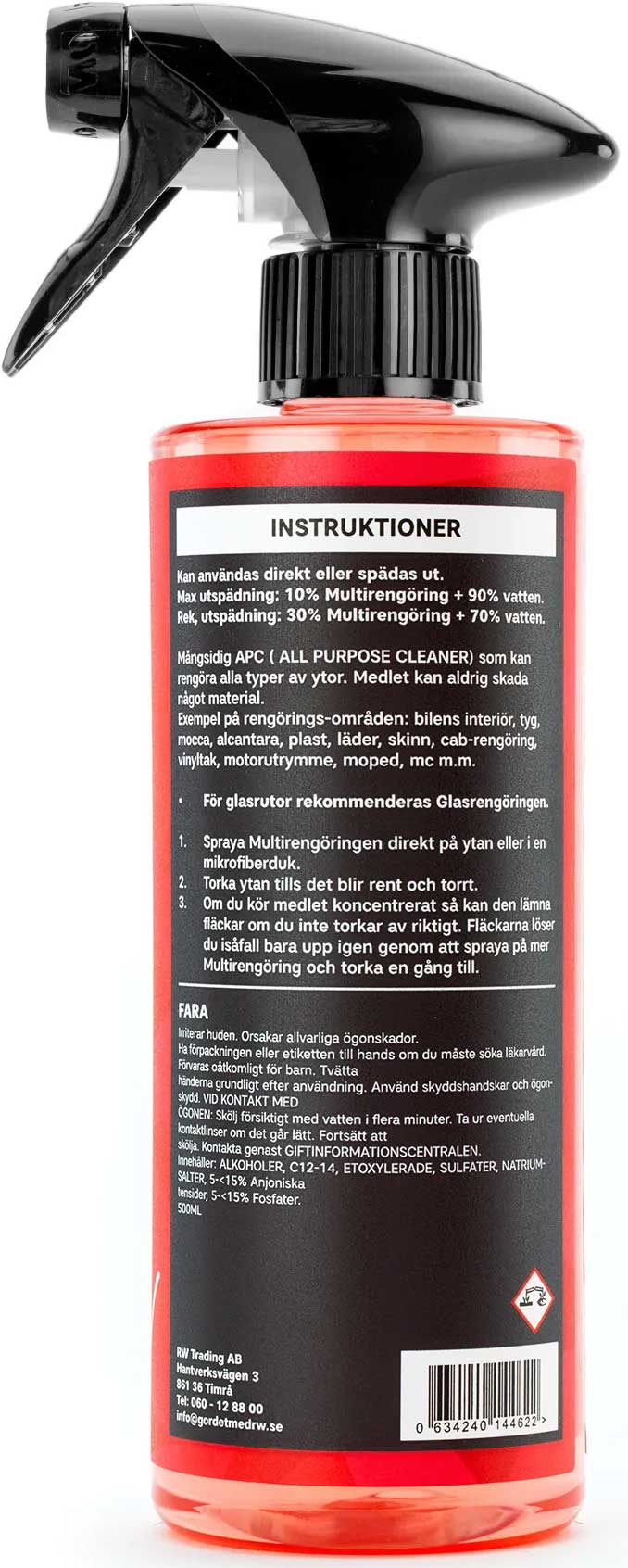 Multirengöringen har en fantastisk förmåga att kunna användas till allt. Våra kunder använder den mest till interiör rengöring av bilen. Men även för att rengöra i hemmet. Såsom i köket, på toaletten, spishällar m.m.