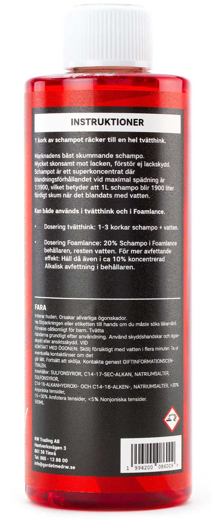 Detta schampo ger ett brutalt tjockt & rengörande skum. Medlet är högkoncentrerat vilket innebär att du endast behöver ytterst lite schampo för att få ett bra skum. 2-3 korkar i en tvätthink, fyll på med vatten och du kommer att få se en skum-explosion. Kan även användas i Foam Lance.