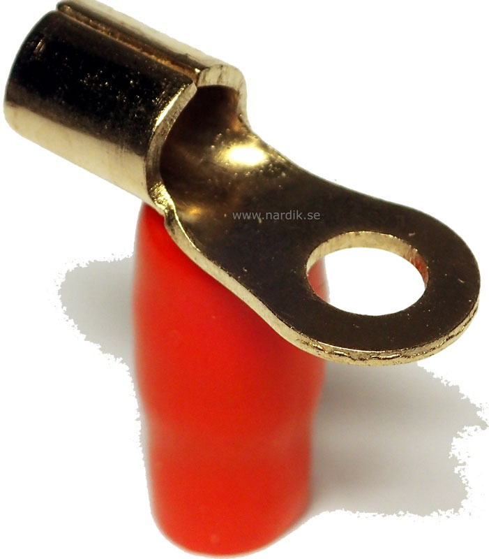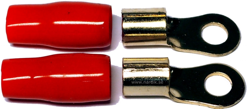 Autoleads Ringkabelsko. För 6-14 mm2 kabel. M6 hål. Förgyllda kontaktytor. Förpackningen innehåller 2 kabelskor med röda skyddshylsor.