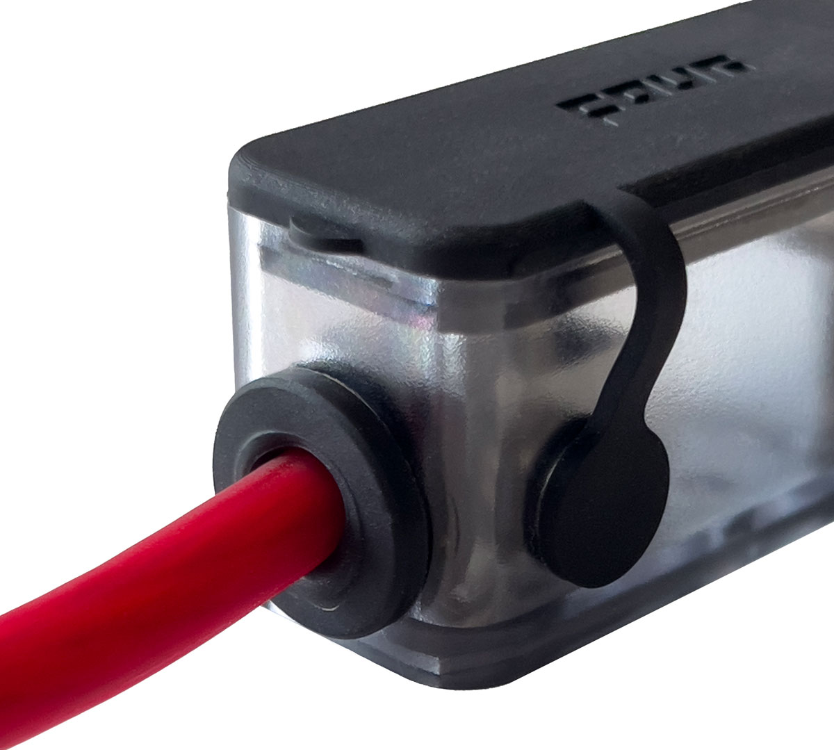Öppningslocket är tillverkat av flexibelt gummi, så att byta säkringar är enkelt och snabbt.