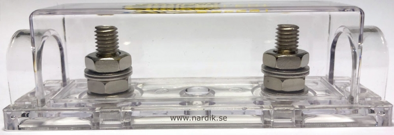Stinger Select ANL säkringshållare med skruvanslutning för M8 ringkabelskor. För kabel upp till 70 mm. Transparent avtagbart skyddslock. För fast montering. Lev utan säkring.