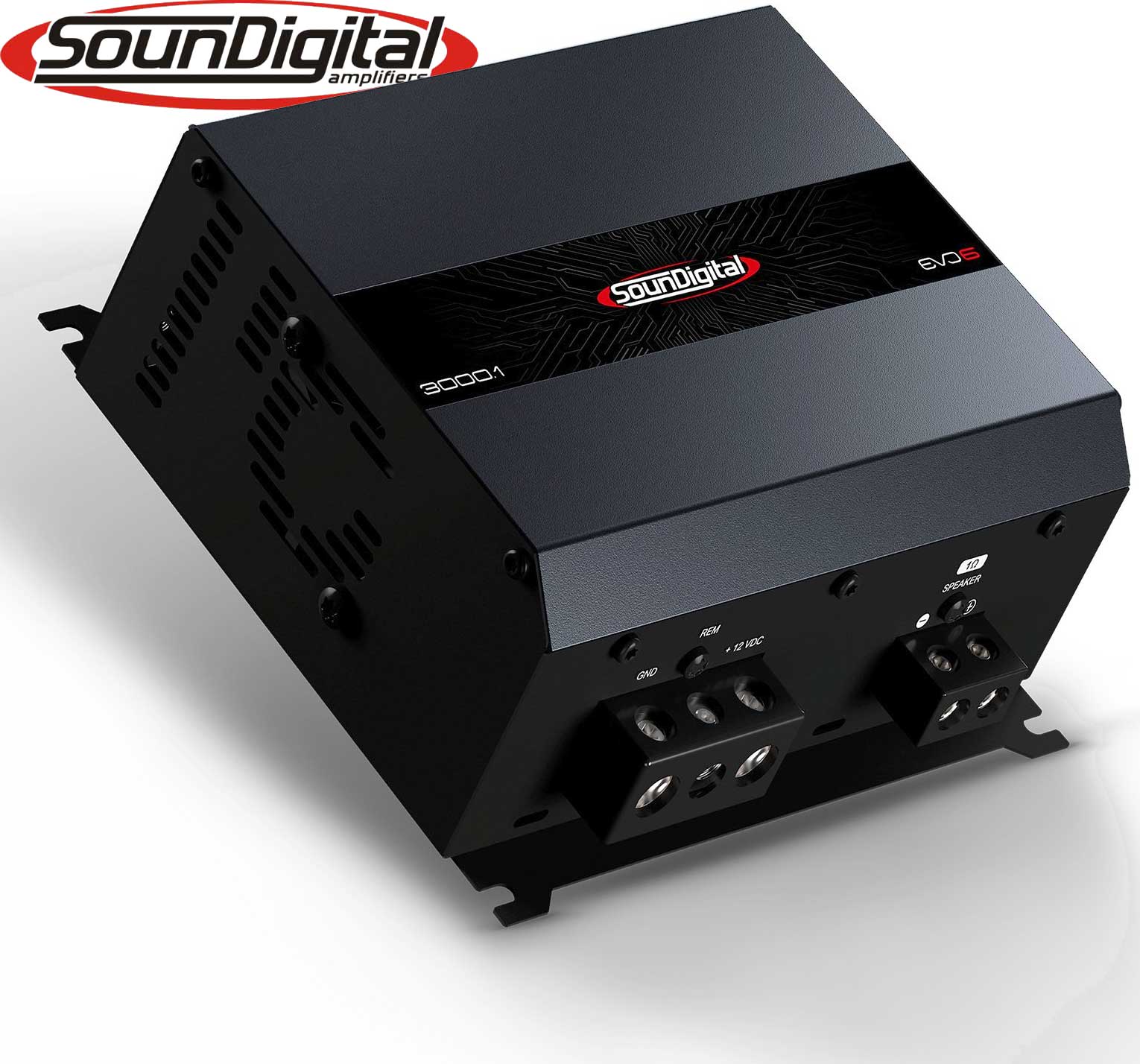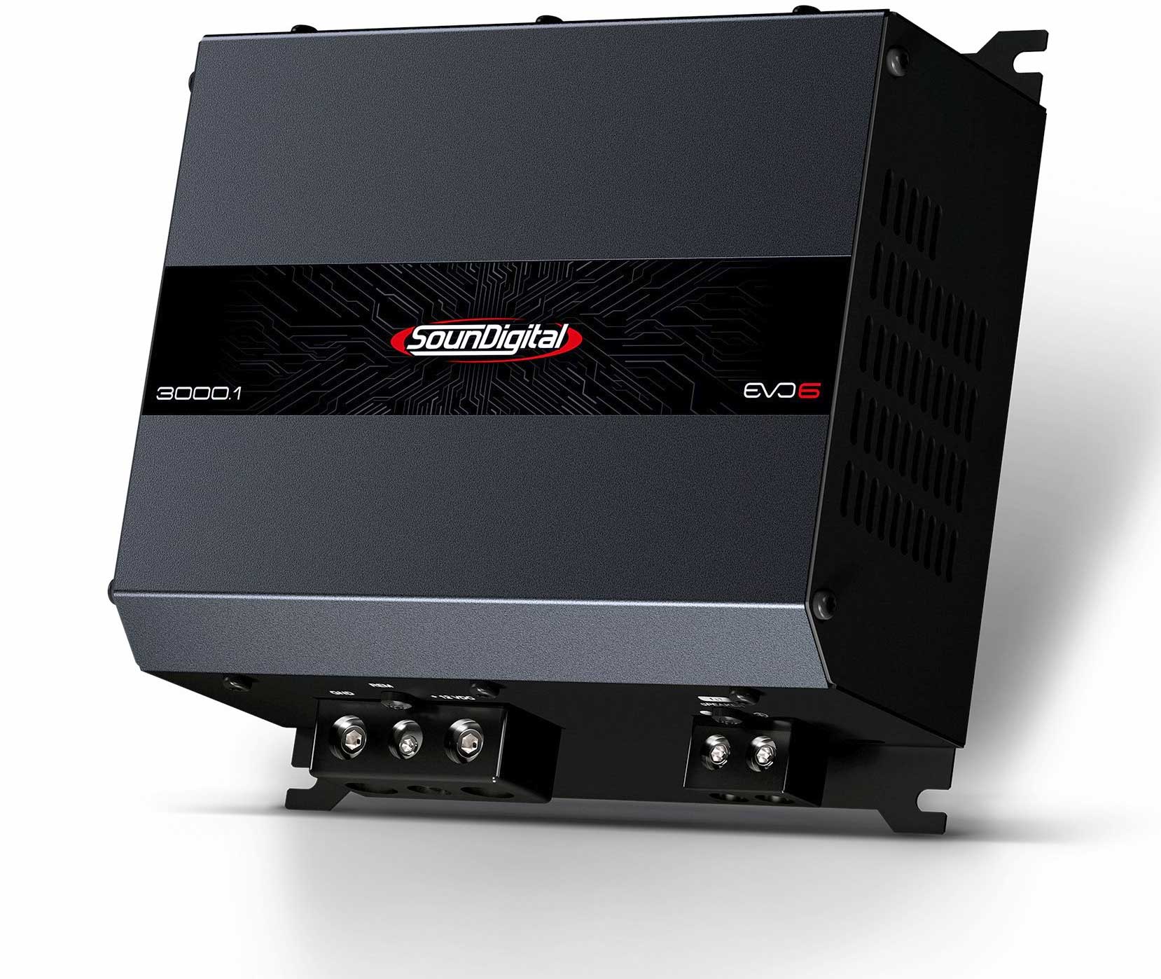 SounDigital 3000.1 EVO 6 - 4Ω Fullregister Monoblock. 1x3000W 12,6V 1% THD. Delningsfilter optimerad för subbas. Kan kopplas till fullregister system eller mellanbas system. Mycket kompakt storlek 150x147,5x60,6 mm. Fläktkyld. Pris för 1 styck.