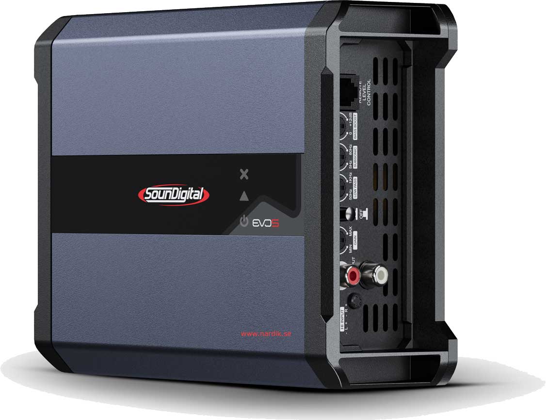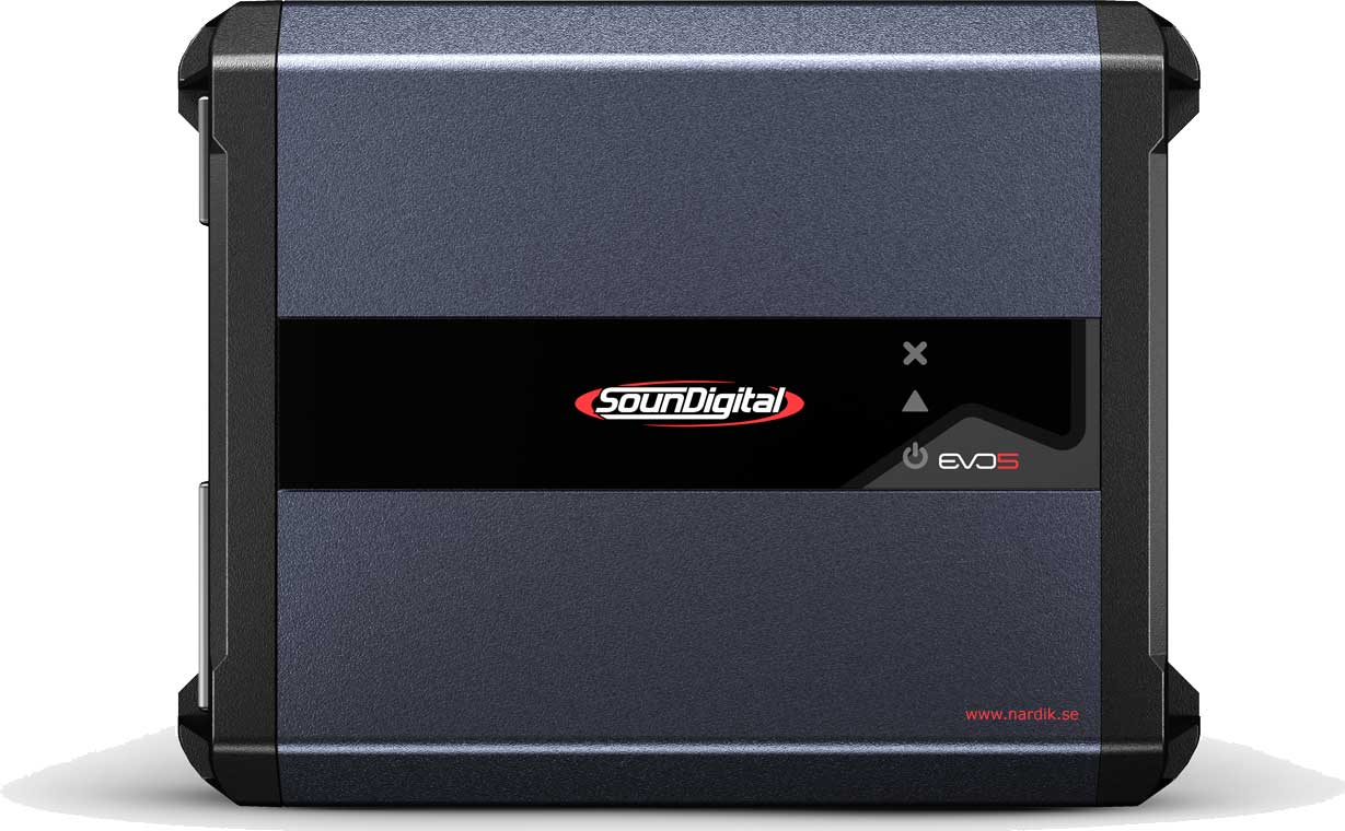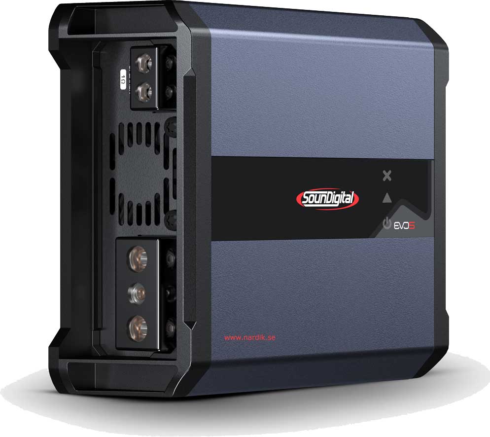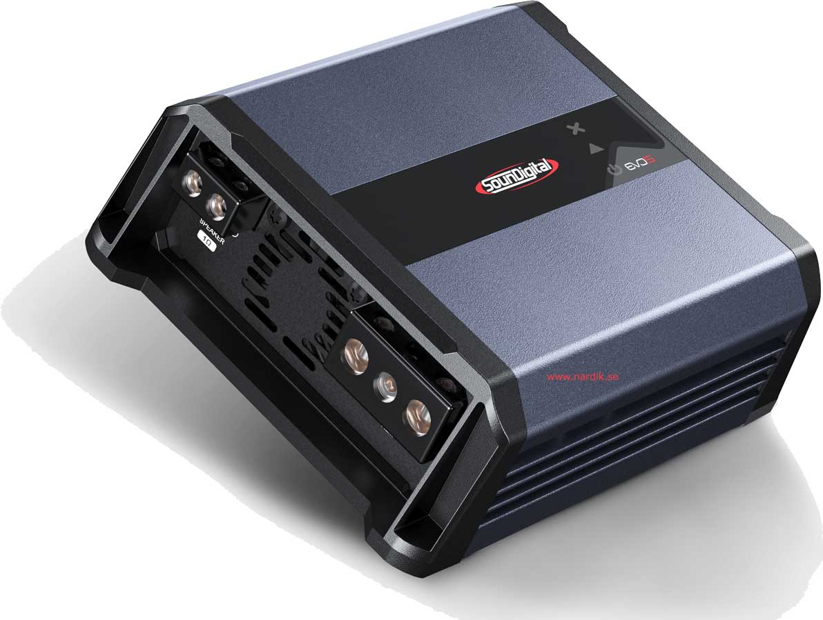 Soundigital 1600.1 EVO 5 - 2Ω Fullregister Monoblock för subbas midbas/diskant system. 1x1600W 12,6V 0,1% THD, Optimerad för 2Ω. Dämpfaktor över 2000! Delningsfilter för subbas. Högnivåingång med autostart, Förberedd för fjärrkontroll. Mått 136 x 186 x 55 mm. Pris för 1 styck