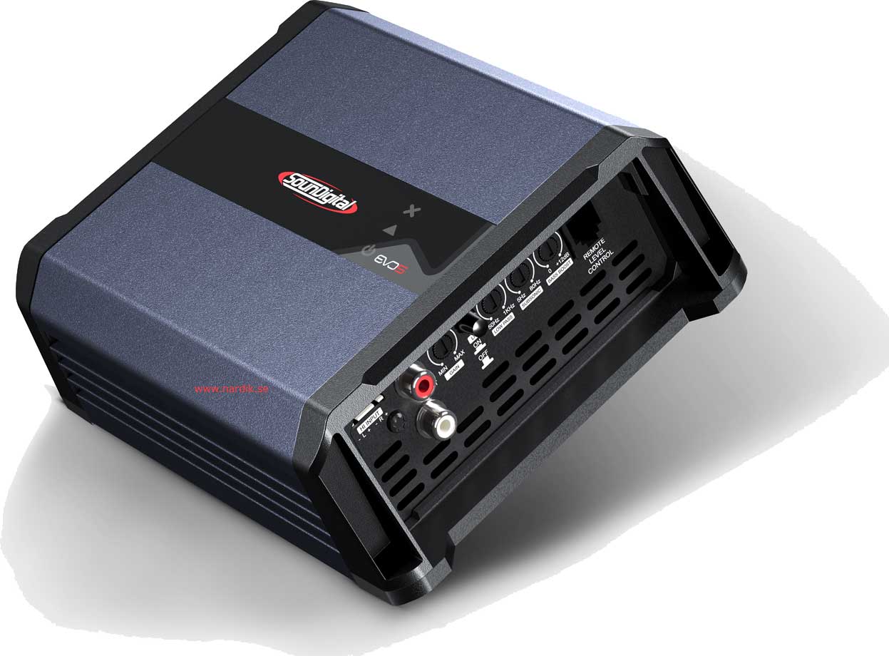 Soundigital 1600.1 EVO 5 - 4Ω Fullregister Monoblock för subbas midbas/diskant system. 1x1600W 12,6V 0,1% THD, Optimerad för 4Ω. Dämpfaktor över 2000! Delningsfilter för subbas. Mått 136 x 186 x 55 mm. Pris för 1 styck