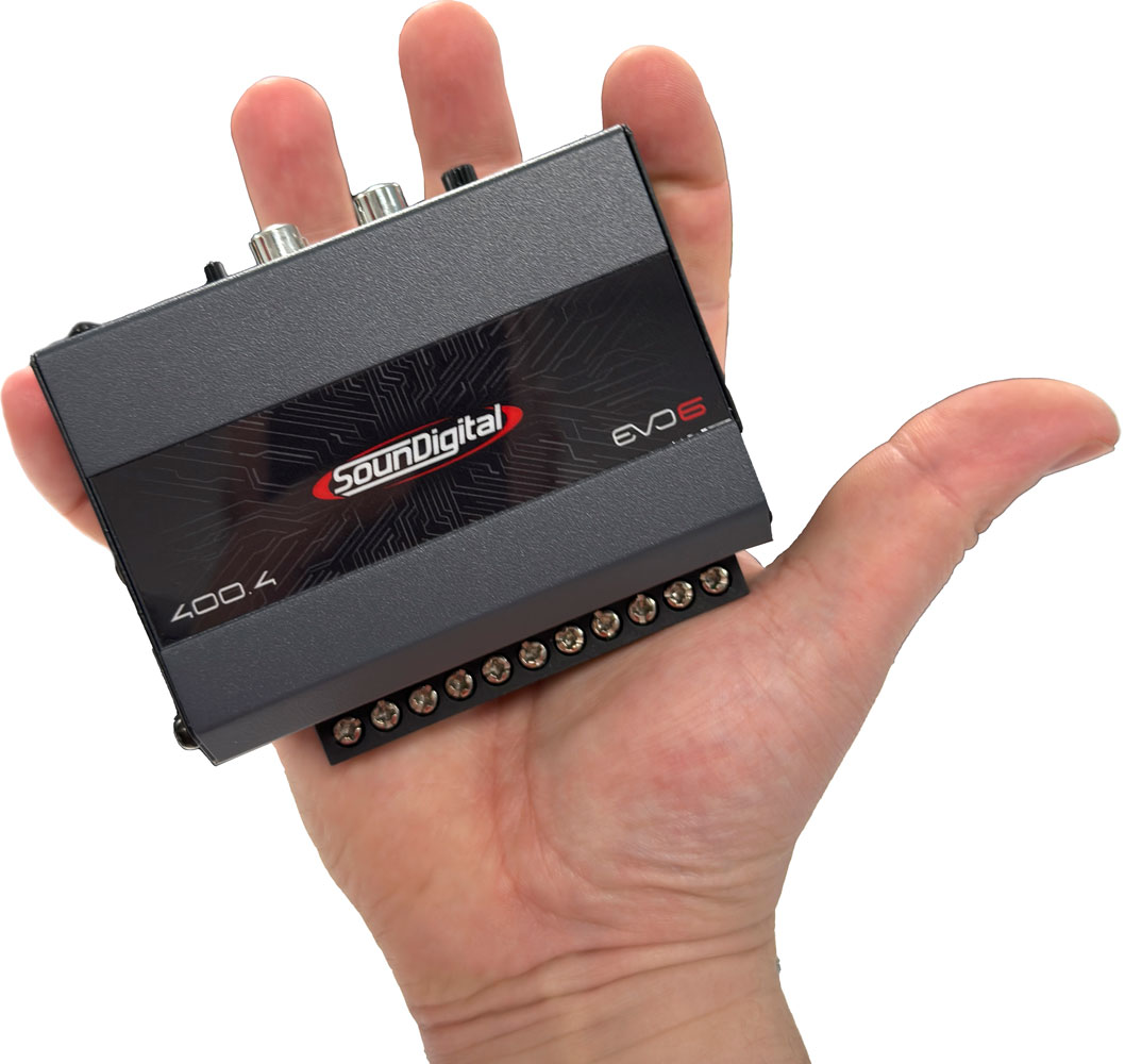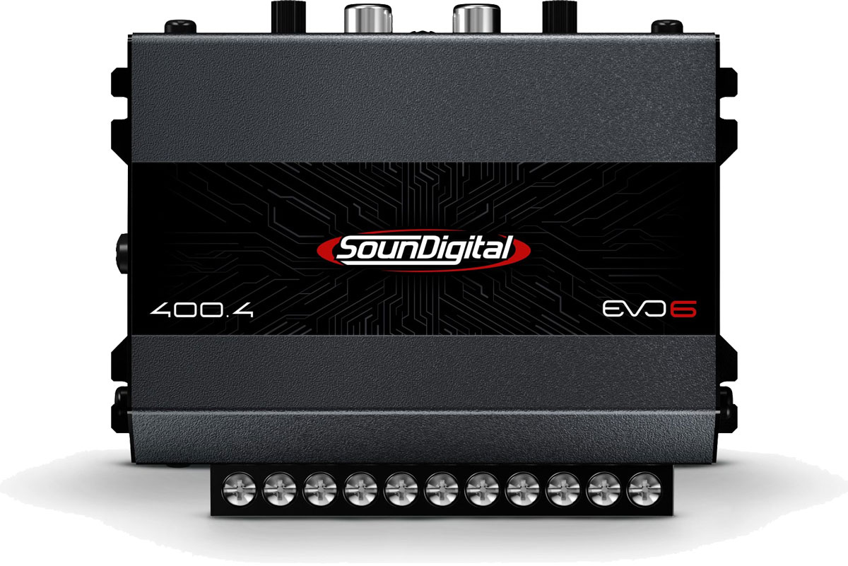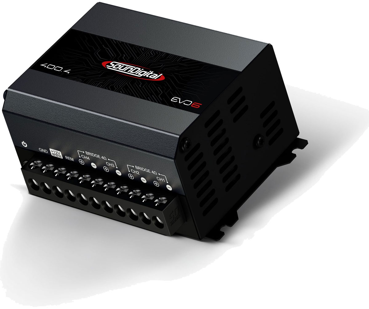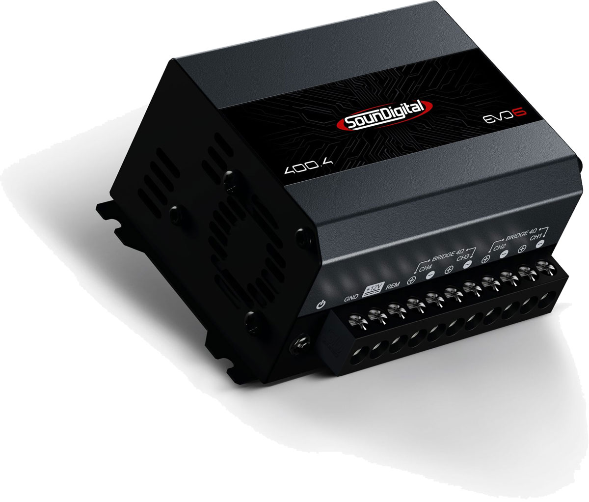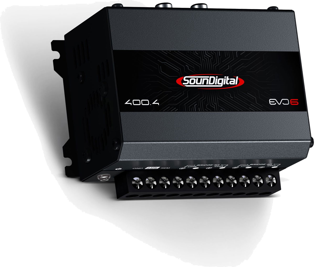 Soundigital SD400.4-4 EVO6.D Microslutsteg med 4 kanaler 4x100W 12,6V 0,1% THD 4Ω, 4x140W 14,4V 0,1% THD 4Ω. Hög & lågpassfilter. Mått 68 x 95 x 46 mm. Pris för 1 styck