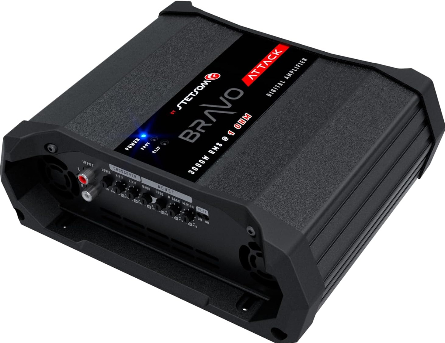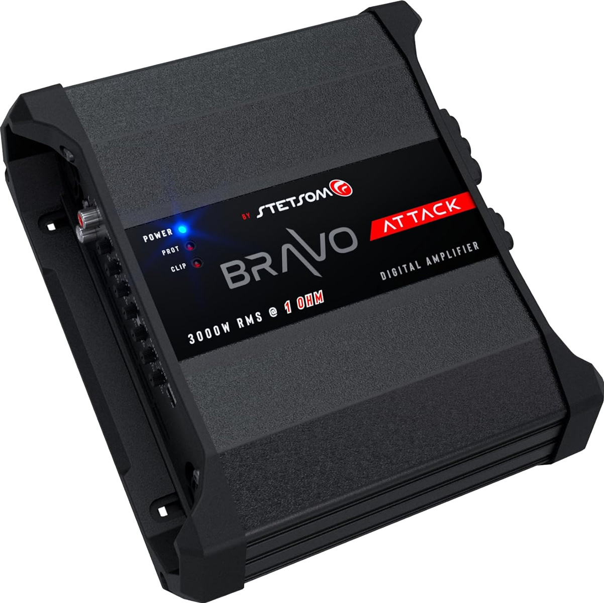 Stetsom Bravo Attack 3000-2 Ohm. Fullregister monoblock. 1x3000W 12,6V 0,1% THD, 1x3700W 14,4V 0,1% THD. Hög och lågpassfilter & EQ för subbas, midbas eller diskant. Fläktkyld. 2,33 Kg. Smidiga mått. Pris för 1 styck