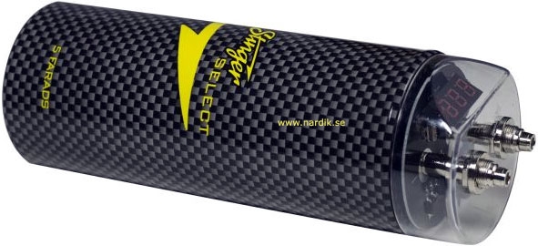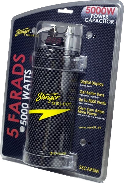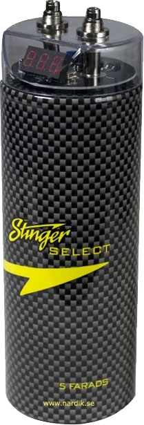 | Stinger Select SPL kondensator. Digital visning av spänning. Kondensator fungerar som en energireserv där förstärkaren kan hämta extra ström blixtsnabbt vid stora effektuttag, t.ex. vid kraftiga attacker i basen. Basåtergivningen i ett ljudsystem är beroende på om förstärkaren får all den ström som krävs i alla ögonblick, annars blir basljudet trött och ansträngt samt kommer att sakna den riktiga "snärten". Mellanregister och diskant ges möjlighet att bibehålla sin renhet och ljudkaraktär. Du kommer att uppleva en ny dimension i ljudet vid höga effektuttag. En Stinger Select kondensator ger snabbt förstärkaren den extra ström som behövs vid till exempel SPL spelning. En annan fördel med en kondensator är att den fungerar som en filterkondensator och hjälper till att filtrera bort störningar som kan komma via strömförsörjningen. Kraftiga 8 mm polskruvar. Levereras med formgjutna fästbyglar. |
