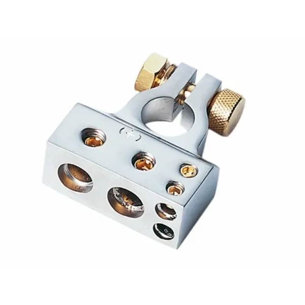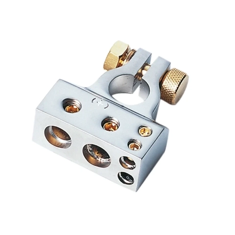 Kraftig polsko för minuspolen i titanplätterad utförande.Anslutningar för 1x 35mm² plus 1x 20mm² och för två 10mm².