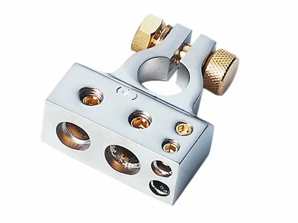 Kraftig polsko för pluspolen i titanplätterad utförande.Anslutningar för 1x 35mm² plus 1x 20mm² och för två 10mm².