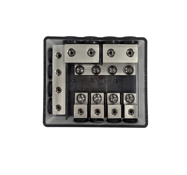Två 50 mm²-ingångar till säkringsdosan passerar genom säkringar och är vid behov fördelade i fyra 20 mm²-utgångar (dessa kontakter är avsedda för + strömmar).
