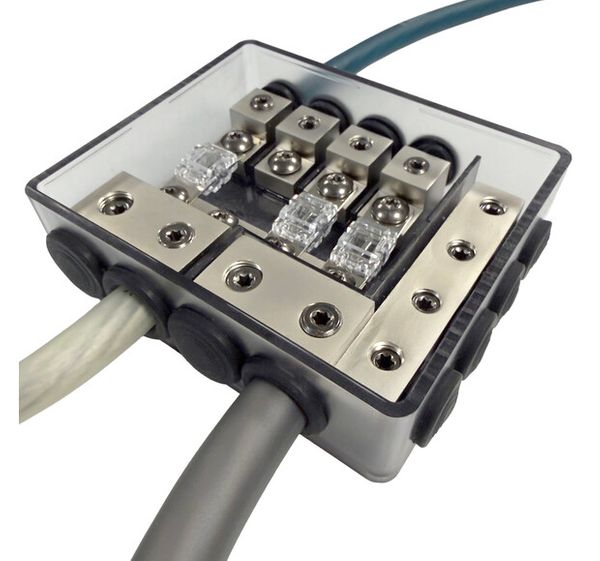 De andra två 50 mm²-ingångarna är konstruerade för jordning (jordblocket har inga säkringsplatser). Kopplingsplinten har fyra stycken med 20 mm²-utgångar.