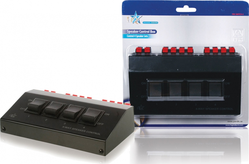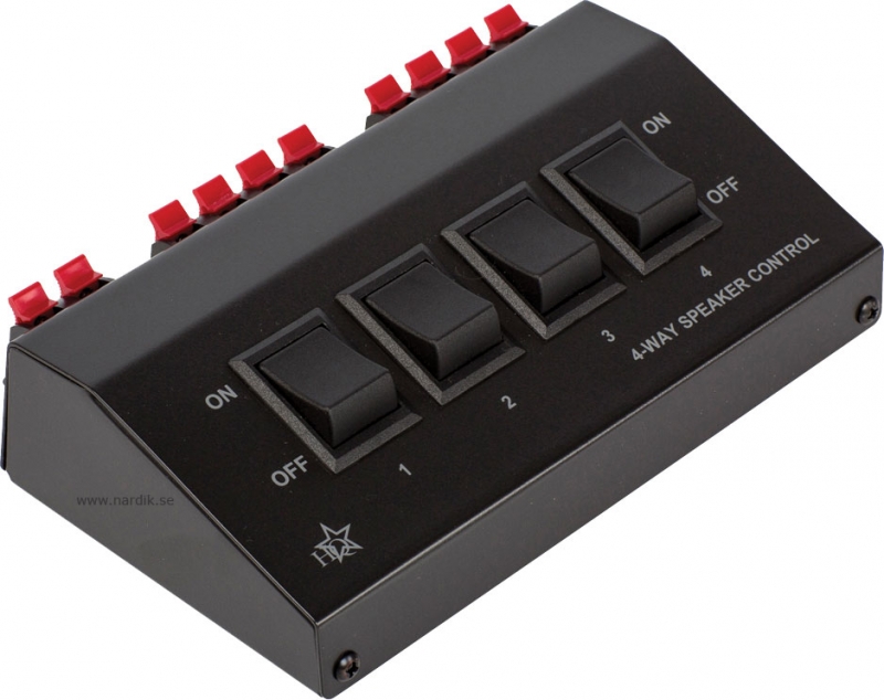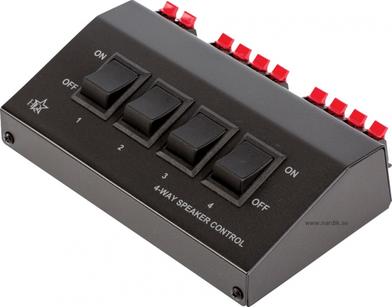 Högtalarväxel. Växla/koppla in 1-4 par högtalare med trycknapparna på framsidan. Klämanslutning för högtalarkabel upp till 2,5 mm². Rejäl växel med låda av metall.